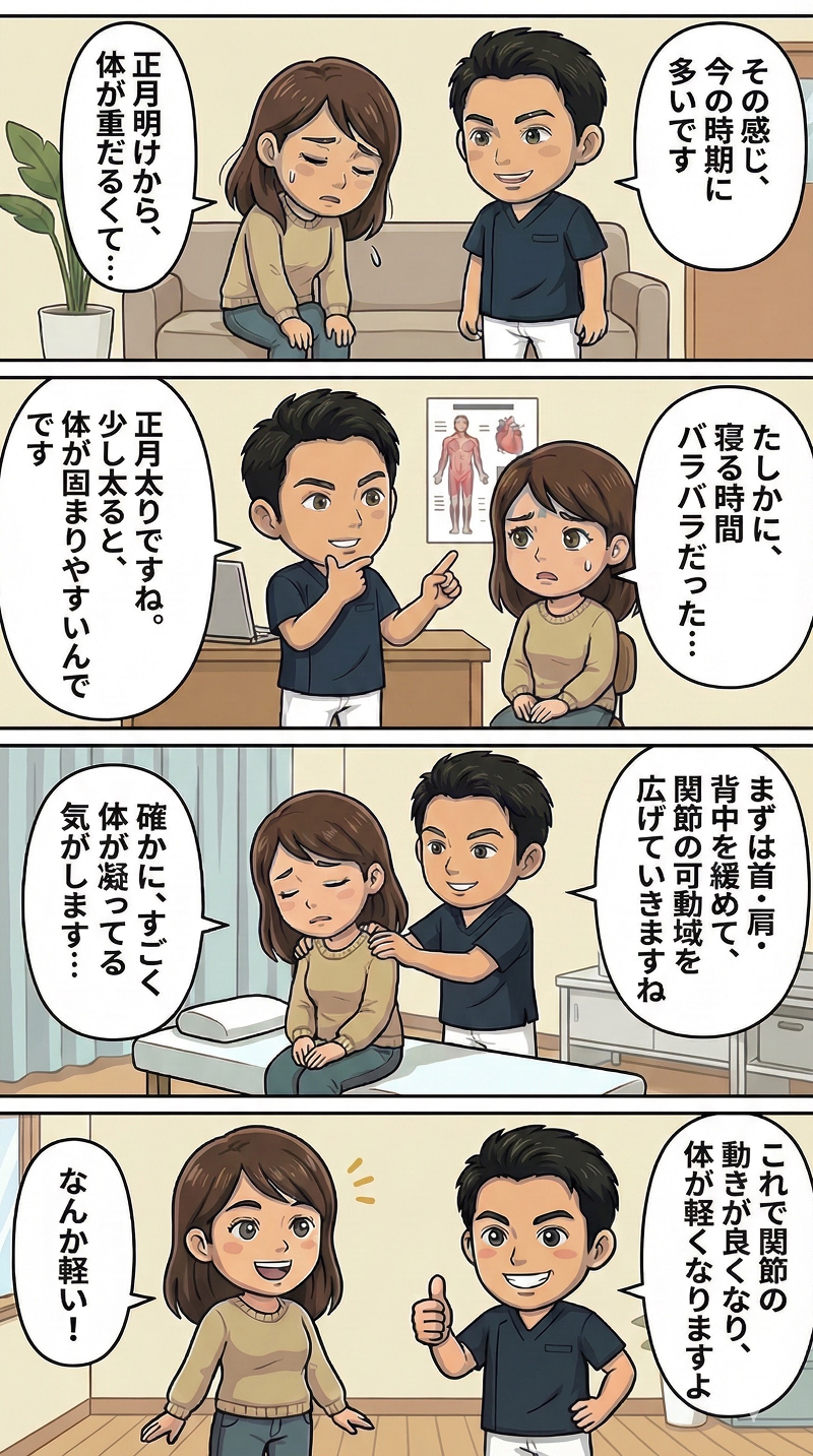 正月明けのように体が固まっている時期は、筋肉だけでなく、骨盤や背骨のバランスが崩れていることが多いからです。