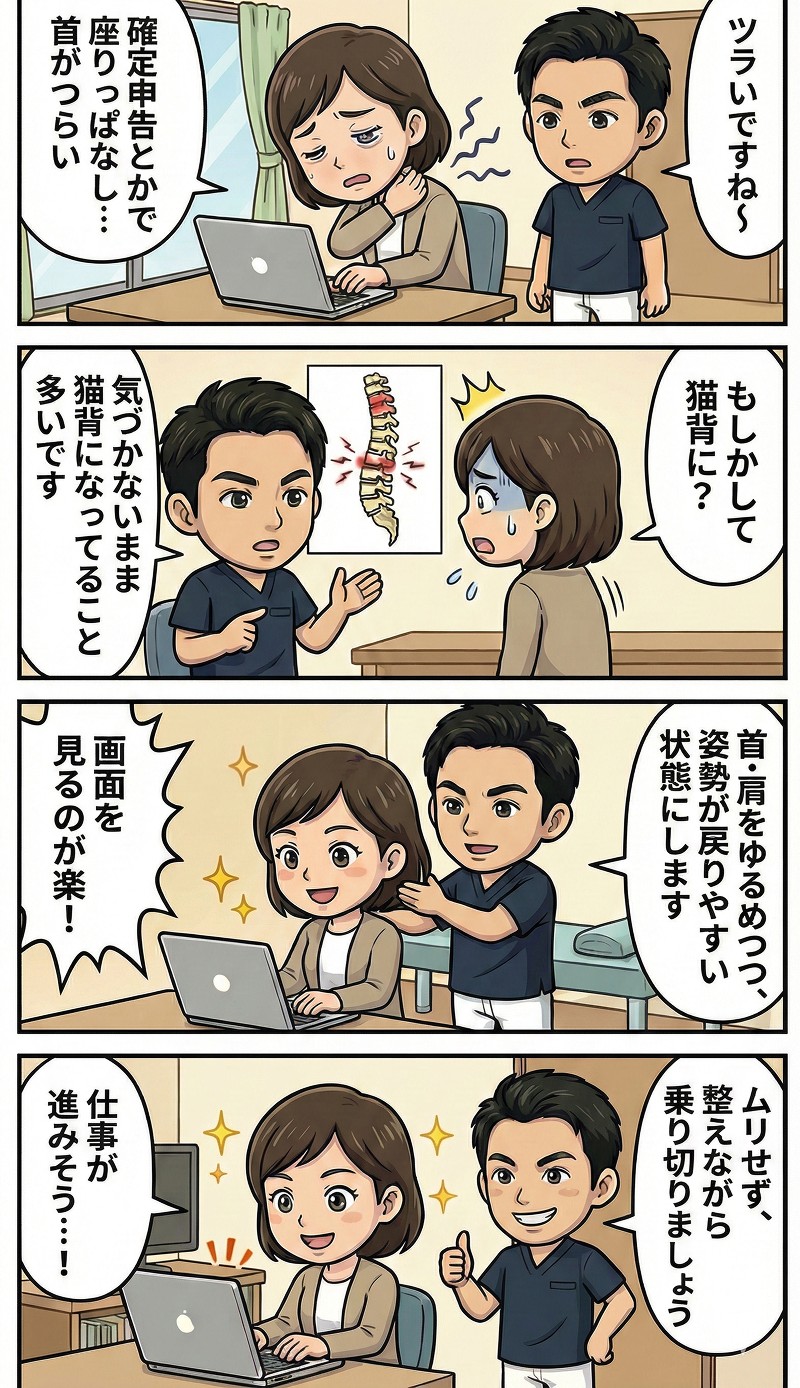 確定申告の時期、首と肩が限界…それ「姿勢の崩れ」かもしれません | つくば市・研究学園の整骨院院長が「流れ」を整理します