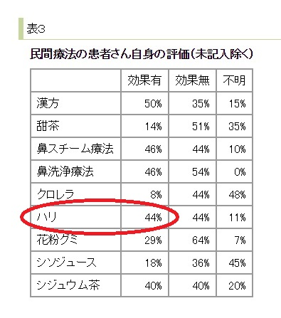 民間医療の科学的評価についてはほとんど行われていません。その方法が必ずしも容易ではないこと、コスト、時間がかかることも原因です。前述の平成12年の私達の調査では、アンケートにより患者さんが実感している民間医療の効果を調べたところ、治療内容によって異なりますが、代表的なものに対しては、漢方薬では効果有50%、効果無35%、不明15%、甜茶に対しては効果有14%、効果無51%、不明35%、鼻スチーム療法は効果有46%、効果無44%、不明10%といったところでした(表3)。